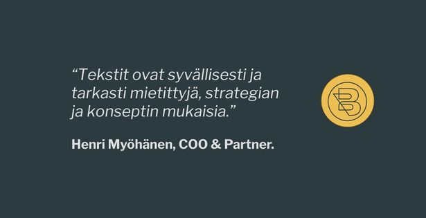 ”On ollut myös upea nähdä, miten Riina on saanut salamana kiinni meidän hyvin korkean tason strategisesta ajattelusta sekä uudenlaisesta brändistrategiatyöstä. Voin aidosti ja lämmöllä suositella superladyä erityisesti vaativiin, strategisiin ja korkean tason ajattelua ja sisältöä vaativiin projekteihin.” –Henri Myöhänen, COO & Partner.